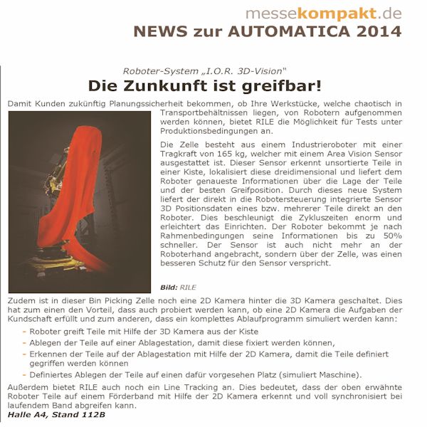RILE News zur Automatica 2014 - Roboter-System "I.O.R. 3D-Vision"